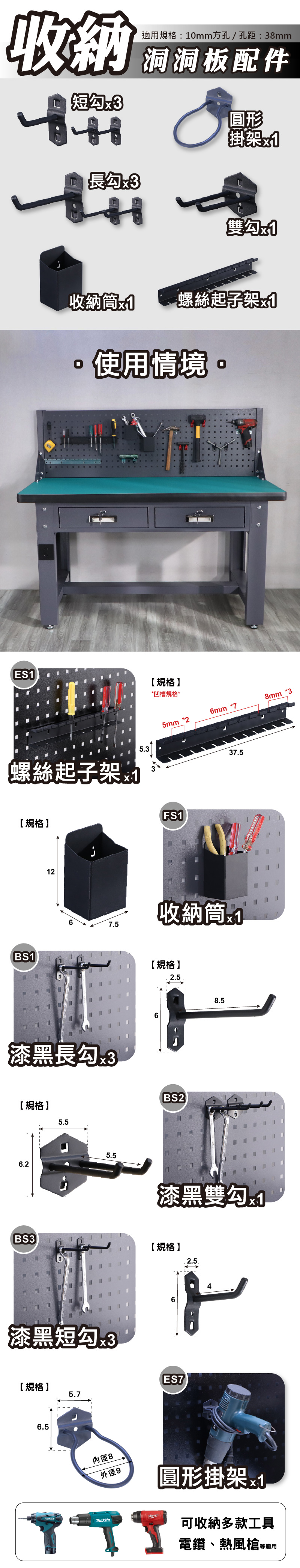 ✔ 整組搭配:長勾、短勾、雙勾、收納筒、螺絲起子架、圓形掛架,全面滿足收納需求